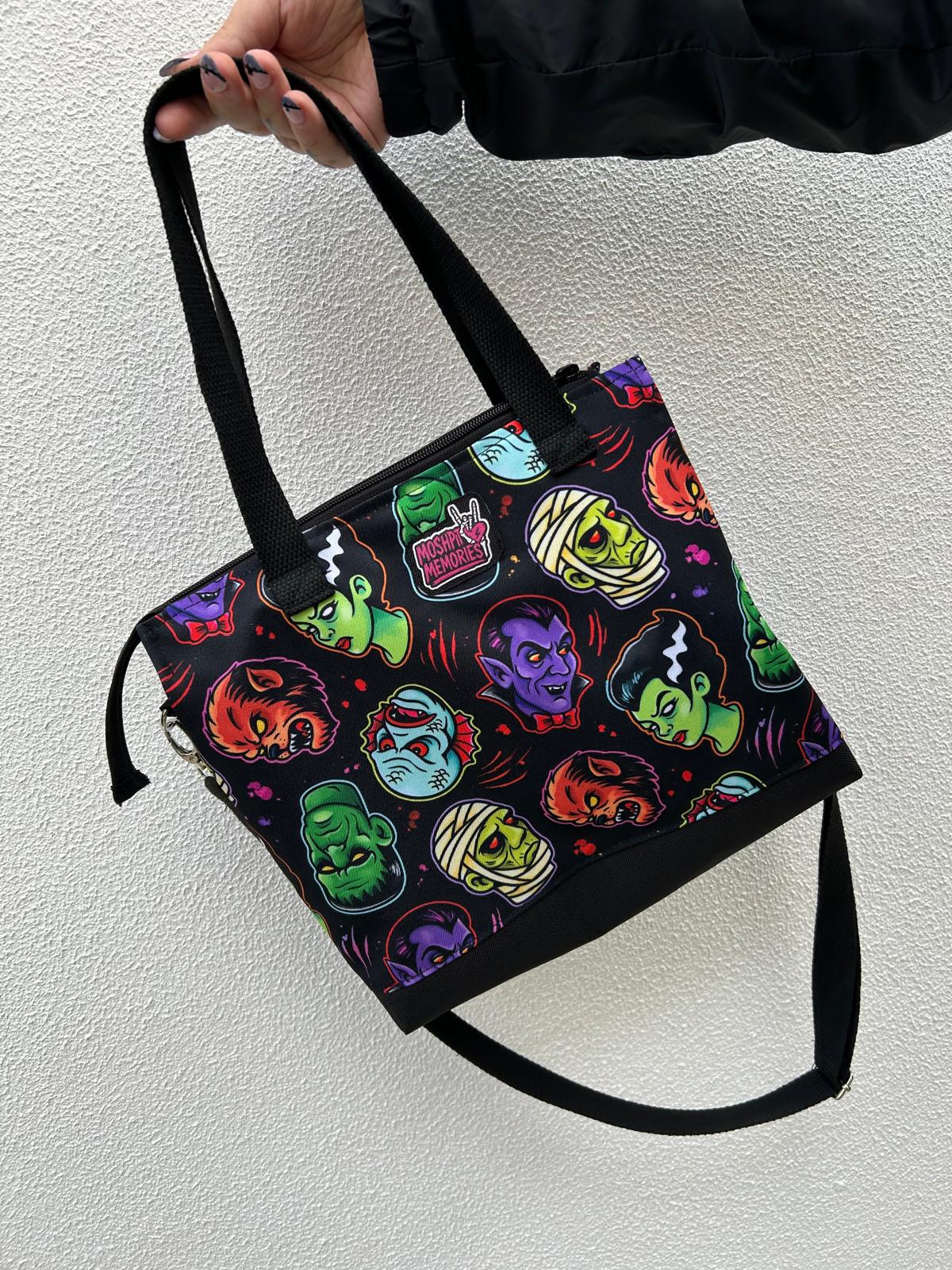 Black tote bag with colorful monster faces and MOSHPIT MEMORIES label