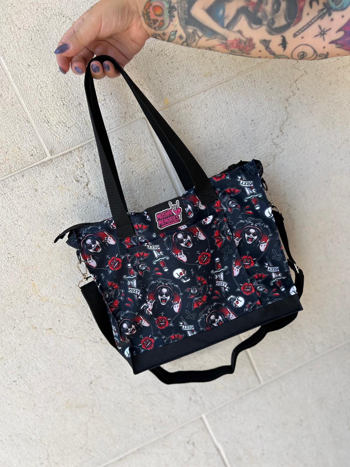 • Black tote bag with dark-themed cartoon prints and text MOSHPIT MEMORIES held by tattooed hand