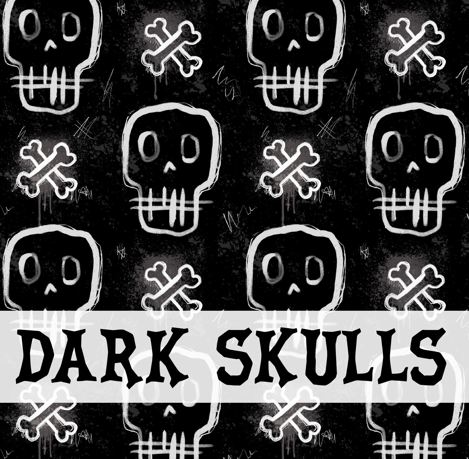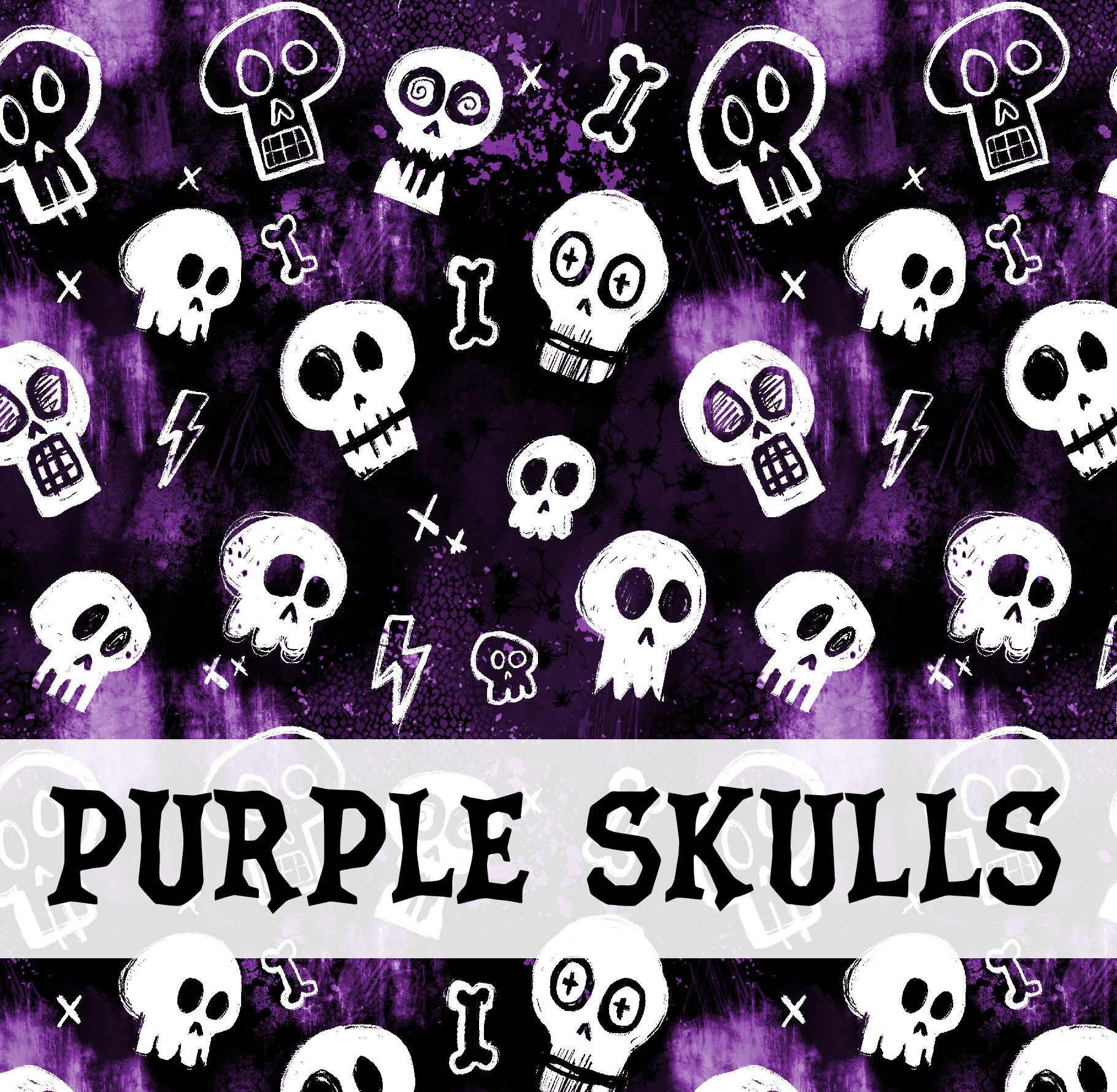 • Pattern of white skulls and bones on a purple background with text PURPLE SKULLS