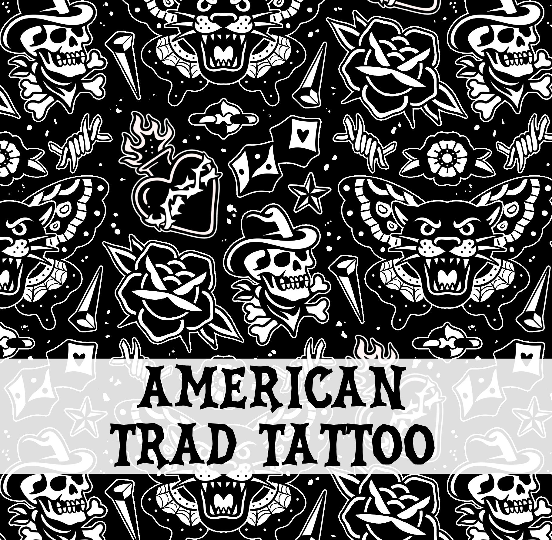 • Black and white American traditional tattoo pattern with skulls, panthers, roses, and text AMERICAN TRAD TATTOO